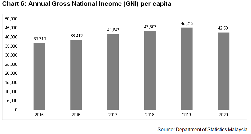 The implications of COVID-19 pandemic have affected economic activities which further contributed to the increase of the unemployment rate 4.8 per cent in the fourth quarter of 2020. Furthermore, the number of underemployed persons increased as compared to 2019. This scenario affects the disposable income which indicates a slowdown and indirectly led to a decrease of the Gross National Income (GNI) per capita from RM45,212 (2019) to RM42,531 in 2020. Meanwhile, movement control imposed by the government led to a reduction in domestic consumption expenditure.