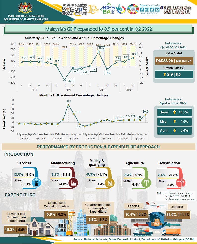 Malaysia’s Gross Domestic Product (GDP) expanded further 8.9 per cent as compared to 5.0 per cent in the previous quarter. Overall, the economy posted a growth of 6.9 per cent (1H 2021: 7.0%) for the first half year of 2022.
