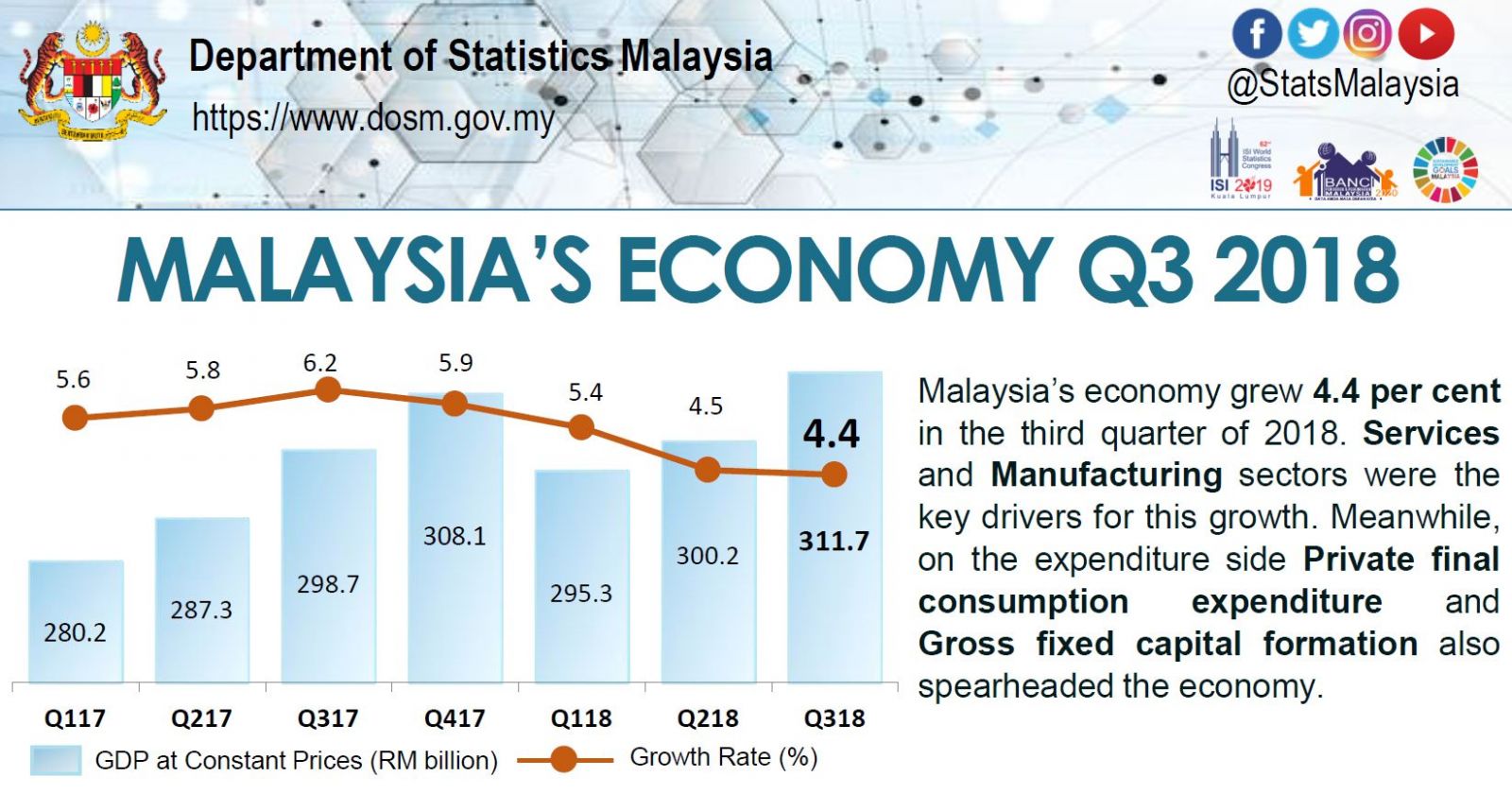 Malaysia’s economy grew 4.4 per cent in the third quarter of 2018 (Q2 2018: 4.5%). On a quarter-on-quarter seasonally adjusted, GDP rose 1.6 per cent against 0.3 per cent in the preceding quarter.