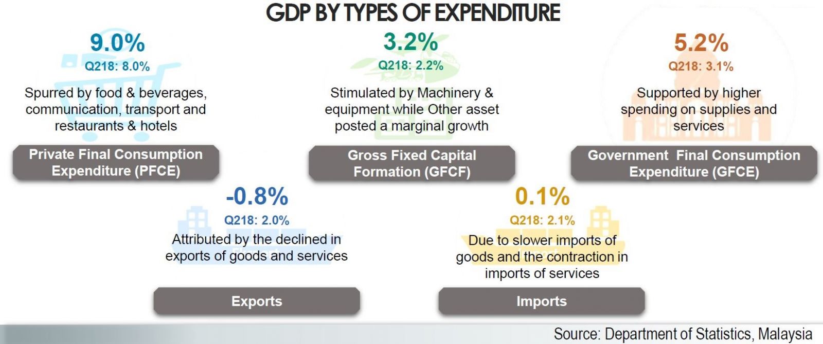 Private final consumption expenditure (PFCE) surged to 9.0 per cent due to higher consumption on food & non alcoholic beverages, communication, transport and restaurant & hotel. A few key events such as tax holiday, Hari Raya Aidiladha, Sukan Malaysia (SUKMA) and long holidays have influenced the expansion of PFCE.