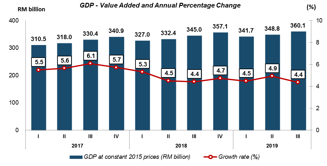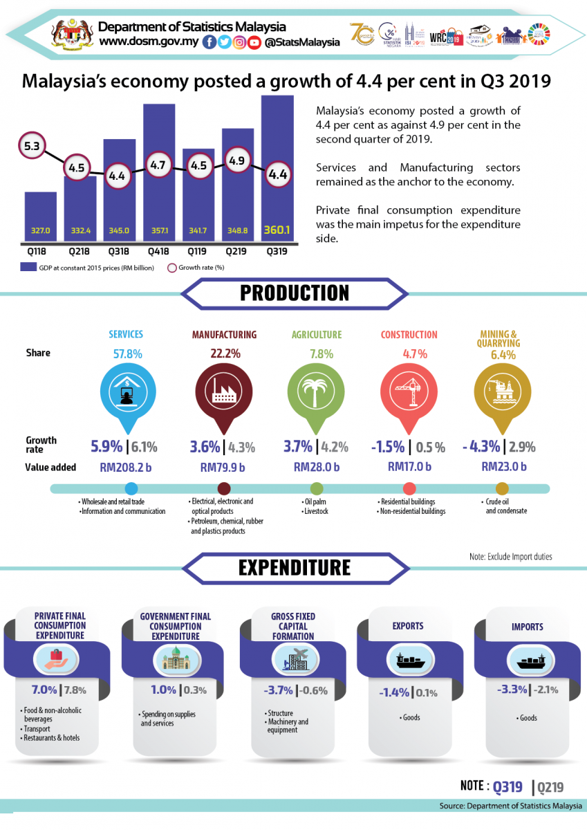 The Gross Domestic Product (GDP) of Malaysia grew 4.4 per cent in the third quarter of 2019 after recording a growth of 4.9 per cent during the second quarter of 2019. Services, Manufacturing and Agriculture sectors were the main drivers of the economy growth for the third quarter 2019. On the expenditure side, Private final consumption expenditure, Net exports and Government final consumption expenditure contribute to the GDP growth, while Gross fixed capital formation decline in third quarter 2019.