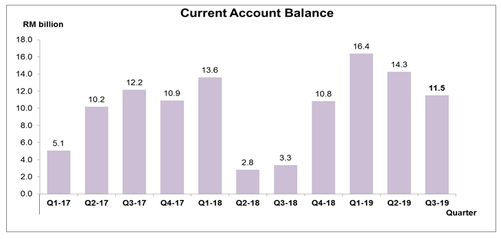 Malaysia’s current account recorded a surplus of RM11.5 billion as compared to RM14.3 billion in the previous quarter. This was led by surplus in Goods Account and lower deficit in Services Account, which was primarily backed by better performance in travel activities. Nevertheless, the overall narrower surplus was influenced by widening deficit in Primary Income due to higher dividend earned by foreign companies. For the period of January to September 2019, the surplus in current account reached RM42.1 billion.
