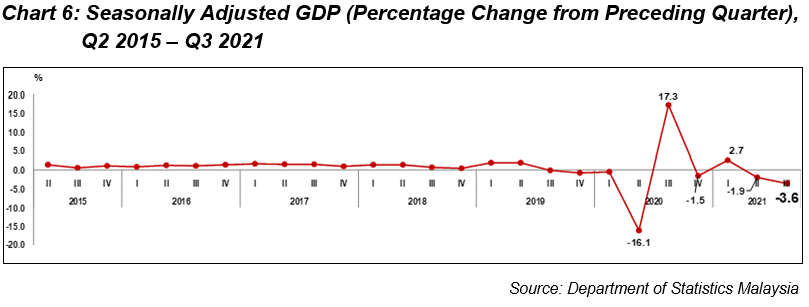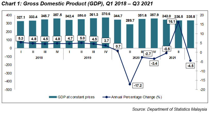 Malaysia’s GDP in the third quarter of 2021 showed a decrease of 4.5 per cent while the quarter-on-quarter seasonally adjusted GDP contracted 3.6 per cent (Q2 2021: -1.9%). Correspondingly, the nation monthly economic performance gradually improved from a contraction of 7.6 per cent in July to a decline of 4.7 per cent in August and further improved to negative 1.1 per cent in September 2021. Approaching year end, Malaysia’s economy grew 3.0 per cent for the sum of three quarters of 2021 (3Qs 2020: -6.4%).