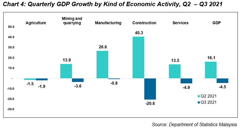 The Manufacturing sector posted a marginal decline of 0.8 per cent (Q2 2021: 26.6%) in the third quarter of 2021. On a quarter-on-quarter seasonally adjusted, this sector fell 1.8 per cent. The decline of Manufacturing sector was affected by the Transport equipment, other manufacturing and repair (-29.6%) and Non-metallic mineral products, basic metal & fabricated metal products (-14.0%). However, Petroleum, chemical, rubber & plastic products (12.6%) and Electrical, electronic & optical products (7.1%) grew at a slower pace in line with the moderate growth in exports of goods recorded in this quarter.