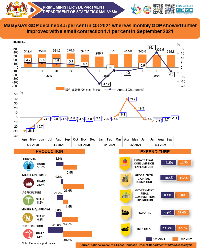 The Imports has expanded to 11.7 per cent (Q2 2021: 37.6%) compared to Exports which grew 5.1 per cent (Q2 2021: 37.4%) in the third quarter 2021. This has resulted the Net exports contracted 37.5 per cent from a growth of 34.3 per cent in the preceding quarter.