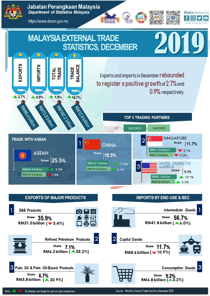 • In 2019, Malaysia’s exports amounted to RM986.4 billion with a decline of 1.7% as compared to last year, while imports worth RM849.0 billion (-3.5%) resulting in a total trade of RM1.8 trillion (-2.5%).