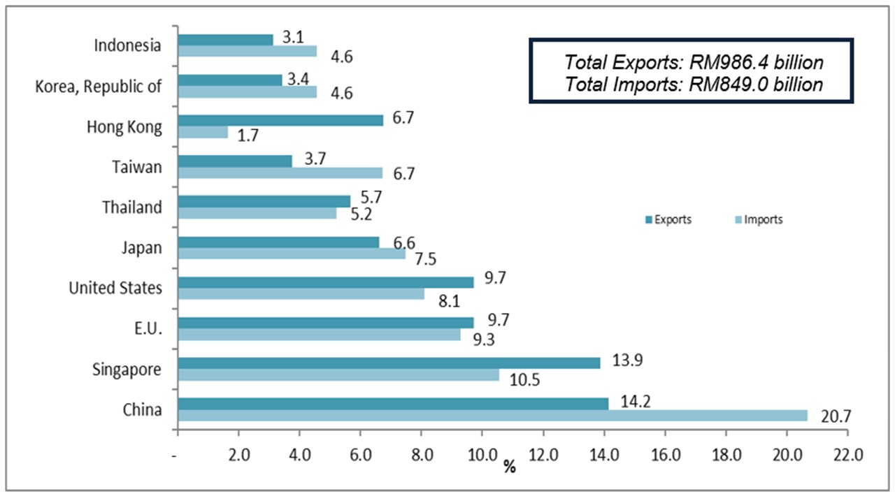 • On a y-o-y basis, exports grew due to the increase in exports to China (+RM2.1 billion), the United States (+RM1.2 billion), Indonesia (+RM979.4 million), Taiwan (+RM721.6 million) and Viet Nam (+RM353.3 million). However, exports decreased to  Hong Kong (-RM1.2 billion) and Japan (-RM855.5 million).