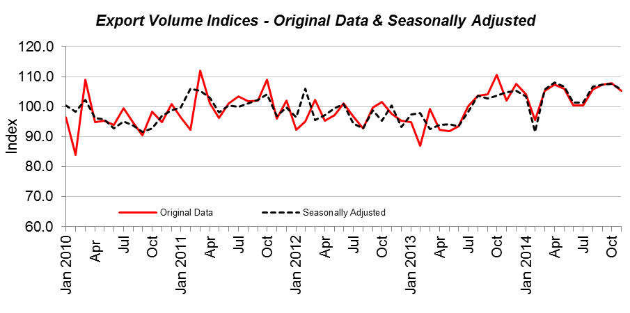 Exports In November 2014, Malaysia’s export value recorded a decline of 2.0% to RM63.7 billion where the export volume index decreased 2.2% to 105.4 points. This was led by animal & vegetable oils & fats (-16.5%), mineral fuels (-14.0%) and chemicals (-3.5%). In contrast, the export unit value index rose 0.1% to 136.7 points. This was mainly contributed by manufactured goods (+0.8%), machinery & transport equipment (+0.6%) and animal & vegetable oils & fats (+0.6%) ![]() Seasonally adjusted figure