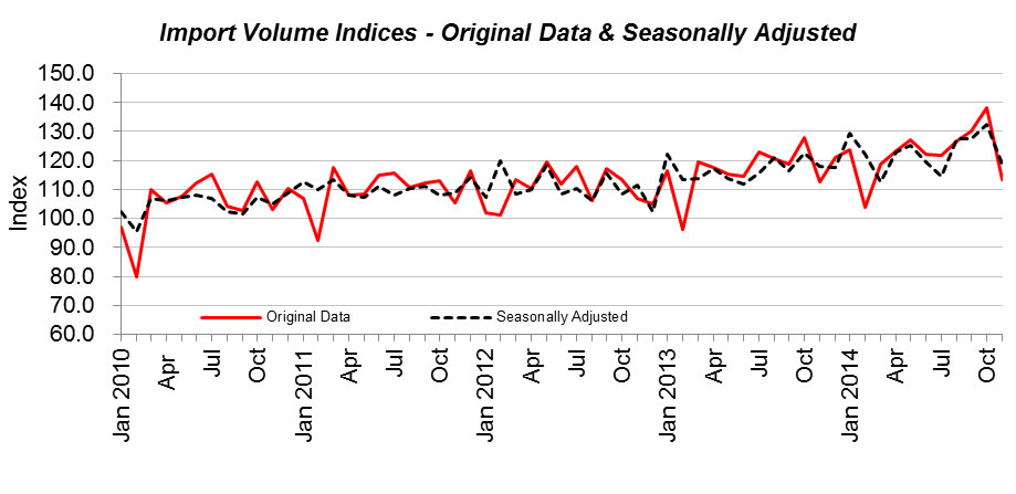 In seasonally adjusted terms, the export volume index decreased 1.6% to 105.8 points. Imports In November 2014, Malaysia’s total import value registered a reduction of 17.7% to RM52.6 billion where the import volume index dropped 17.9% to 113.4 points. This was mainly attributed to mineral fuels (-35.5%), inedible crude materials (-25.6%) and machinery & transport equipment (-19.0%). In contrast, the import unit value index rose 0.2% to 130.4 points which was led by machinery & transport equipment (+1.6%) and inedible crude materials (+1.6%). ![]() Seasonally adjusted figure