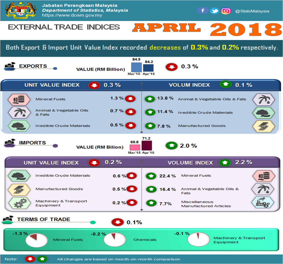 On a month-on-month (m-o-m) basis, in April 2018, the export unit value index dropped 0.3% to 112.4 points which was attributed to mineral fuels (-1.3%) followed by animal & vegetable oils & fats (-0.7%) and inedible crude materials (-0.5%). Meanwhile, the export volume index registered an increase of 0.1% to 140.9 points. The increase was led by animal & vegetable oils & fats (+13.8%), inedible crude materials (+11.4%) and manufactured goods (+7.8%). In seasonally adjusted terms, the export volume index expanded 9.3% to 146.3 points.