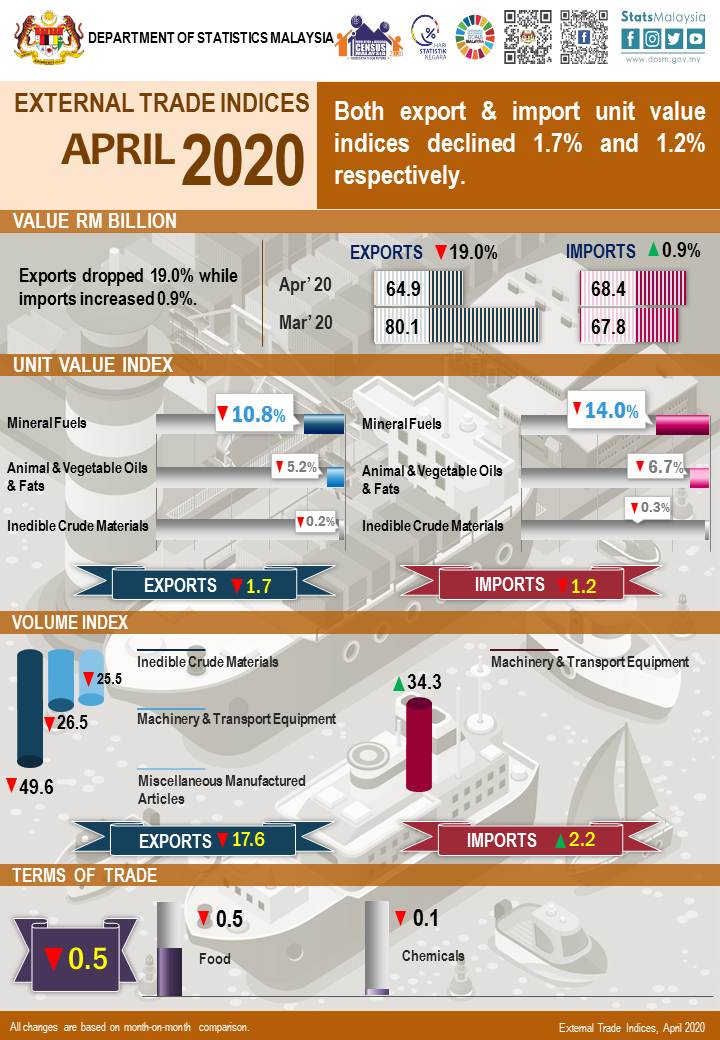 In April 2020, the import unit value index recorded a decline of 1.2% to 114.8 points which was due to the decrease in the index of mineral fuels (-14.0%), animal & vegetable oils & fats (-6.7%) and inedible crude materials (-0.3%). In contrast, the import volume index rose 2.2% to 135.6 points. This was contributed by the increase in the index of machinery & transport equipment (+34.3%). In seasonally adjusted terms, the import volume index in April 2020 rose 4.5% to 140.8 points.
