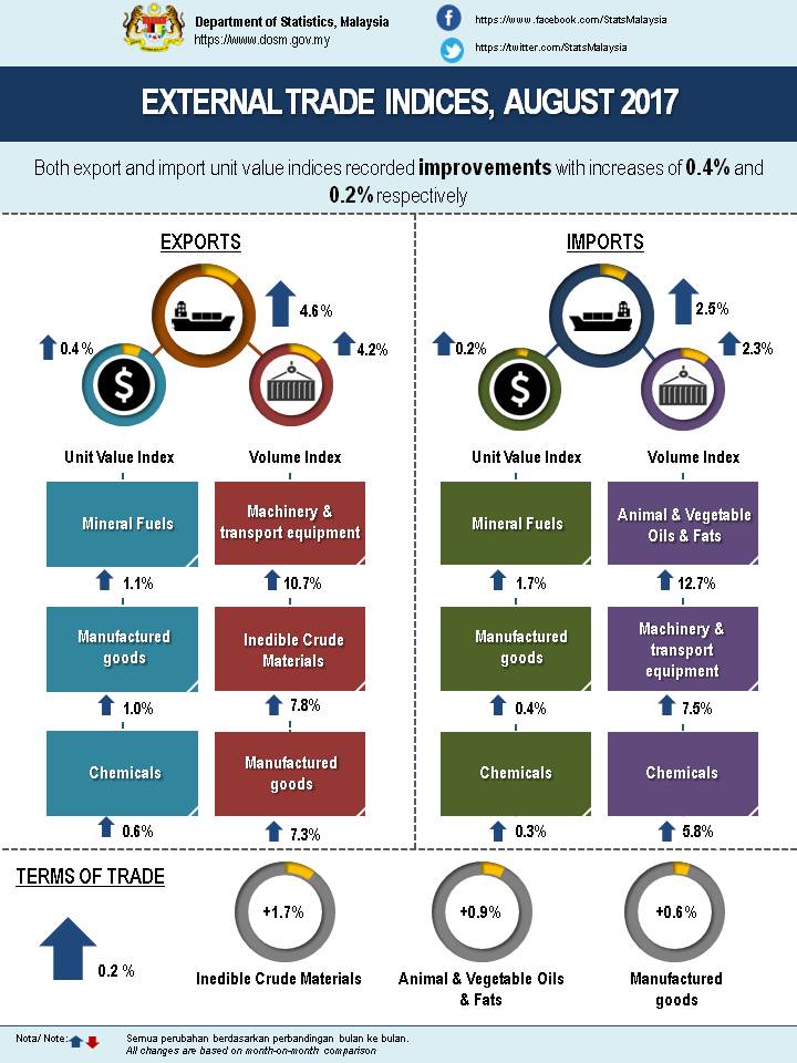 Malaysia’s terms of trade recorded a rise of 0.2% to 97.2 points when compared with July 2017. Meanwhile, a rise of 1.9% was recorded year-on-year basis.