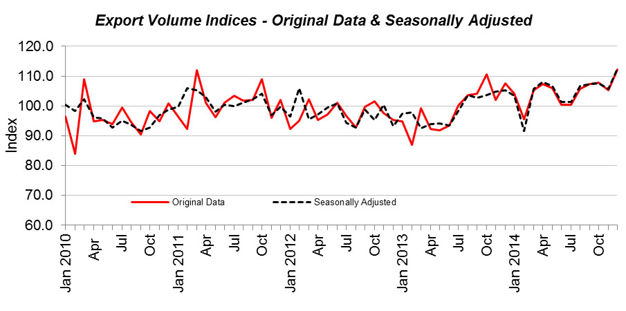 In seasonally adjusted terms, the export volume index in December 2014 rose 6.4% to 112.5 points.