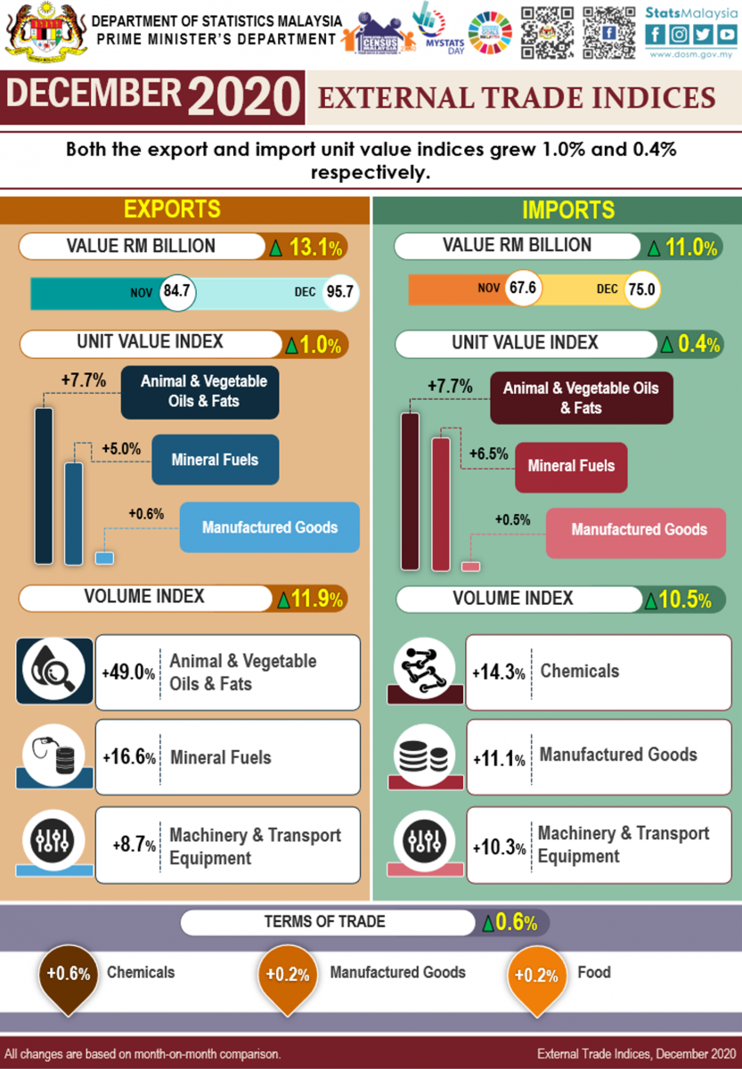 The full publication of the External Trade Indices, December 2020 can be downloaded through eStatistik Portal.