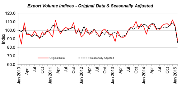 In seasonally adjusted terms, the export volume index decreased 18.1% to 85.7 points.