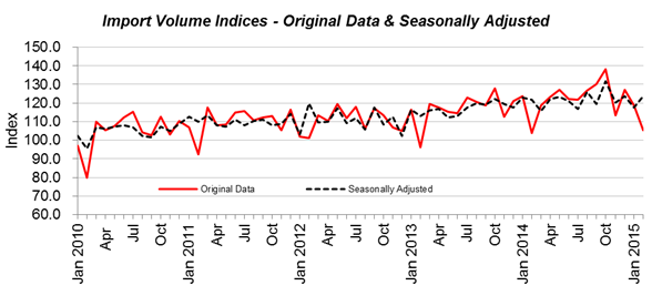 In seasonally adjusted terms, the import volume index in February 2015 increased 5.3% to 123.8 points.