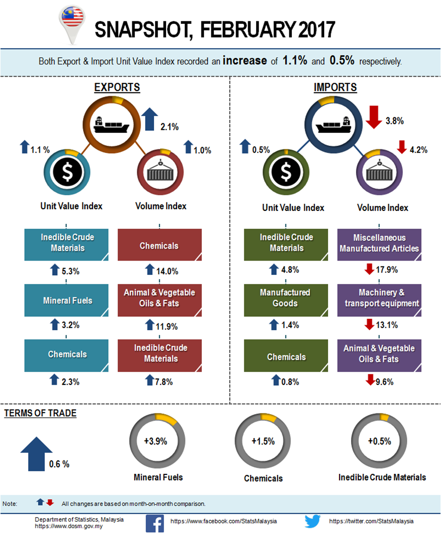 In February 2017, Malaysia’s terms of trade increased 0.6% to 98.0 points when compared with January 2017. Meanwhile, a rise of 1.3% was recorded year-on-year.