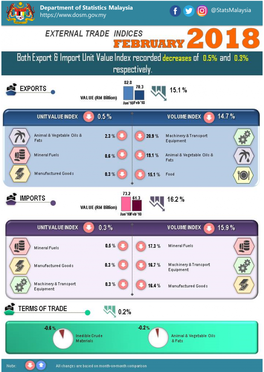 On a month-on-month (m-o-m) basis, in February 2018, the export unit value index dropped 0.5% to 112.0 points which was attributed to animal & vegetable oils & fats (-2.3%), mineral fuels (-0.6%) and manufactured goods (-0.3%). Meanwhile, the export volume index registered a decrease of 14.7% to 118.0 points. This decrease was led by machinery & transport equipment (-20.9%), animal & vegetable oils & fats (-19.1%) and food (-15.1%). In seasonally adjusted terms, the export volume index declined 8.8% to 130.0 points.
