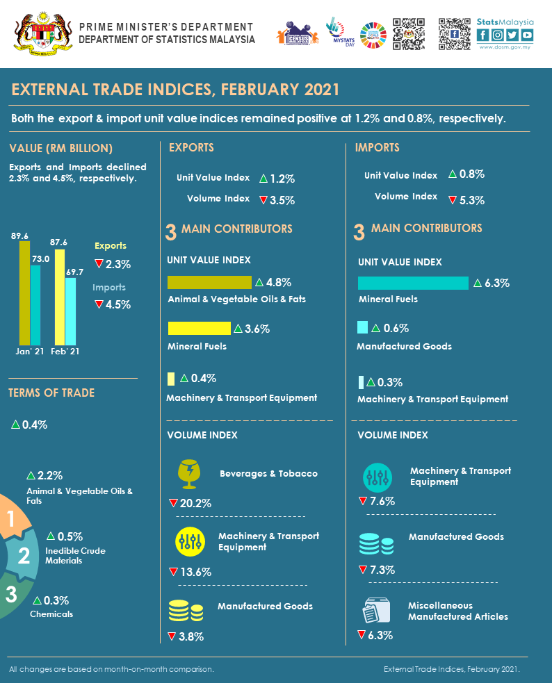 The full publication of the External Trade Indices, February 2021 can be downloaded through eStatistik Portal.