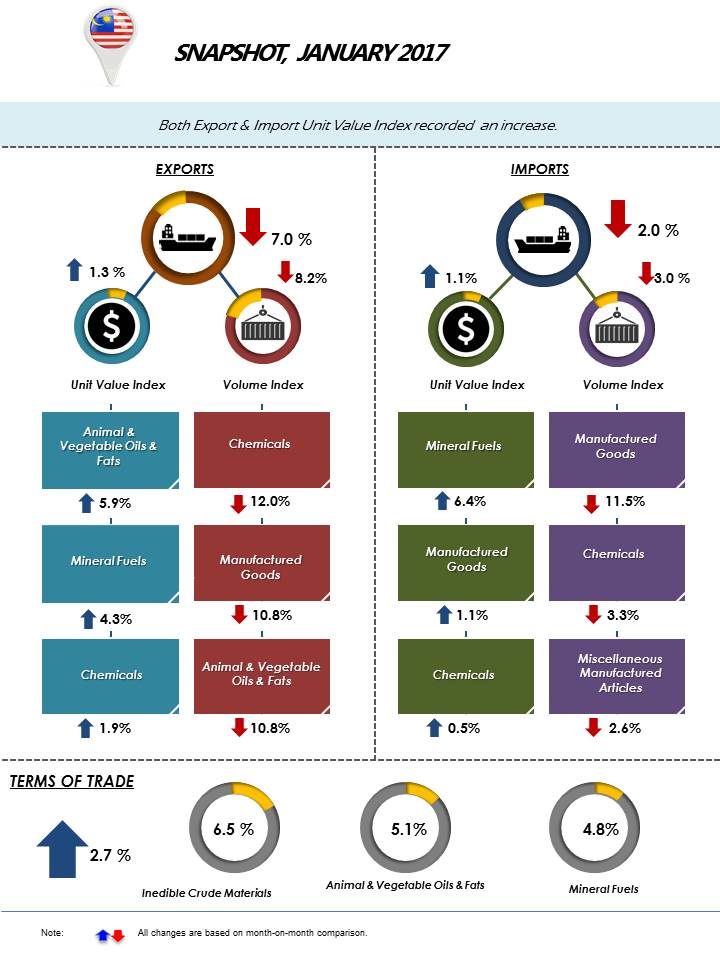 In January 2017, Malaysia’s terms of trade recorded an increase of 2.7% to 97.4 points when compared with the preceding month, while a reduction of 0.5% was recorded year-on-year.