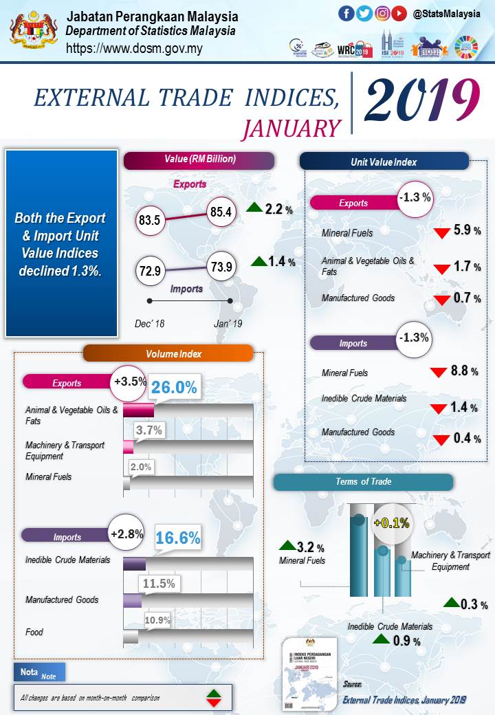 On a month-on-month (m-o-m) basis, in January 2019, the export unit value index recorded a reduction of 1.3% to 114.1 points which was mainly attributed to a decrease in the index of mineral fuels (-5.9%) followed by animal & vegetable oils & fats (-1.7%) and manufactured goods (-0.7%). Meanwhile, the export volume index registered an increase of 3.5% to 140.7 points. The increase was led by the index of animals & vegetable oils & fats (+26.0%), machinery & transport equipment (+3.7%) and mineral fuels (+2.0%). In seasonally adjusted terms, the export volume index increased 9.1% to 143.1 points.