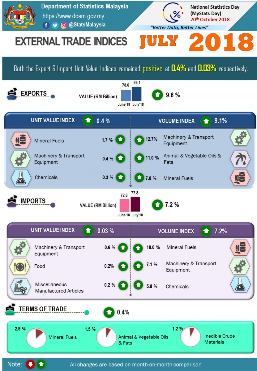 In July 2018, the import unit value index also increased 0.03% to 118.4 points compared to Jun 2018 which was mainly led by machinery & transport equipment (+0.6%) followed by food (+0.2%) and miscellaneous manufactured articles (+0.2%). The import volume index increased 7.2% to 149.5 points. This was mainly attributed to mineral fuels (+18.0%), machinery & transport equipment (+7.1%) and chemicals (+5.8%). In seasonally adjusted terms, the import volume index increased 4.0 % to 146.0 points.