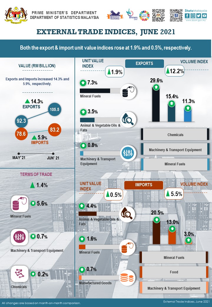 The full publication of the External Trade Indices, June 2021 can be downloaded through eStatistik Portal.