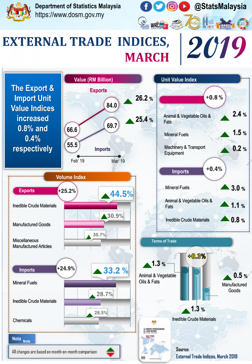 Malaysia’s terms of trade posted a inceased of 0.3% to 98.3 points when compared with February 2019. On a year-on-year basis, Malaysia’s terms of trade expanded 0.6% from 97.4 points..