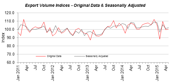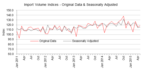 In seasonally adjusted terms, the import volume index in May 2015 increased 1.2% to 115.4 points.