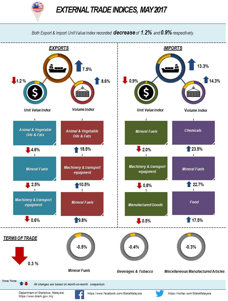 In May 2017, Malaysia’s terms of trade decreased by 0.3% to 97.5 points when compared with April 2017. Meanwhile, a rise of 1.7% was recorded year-on-year.