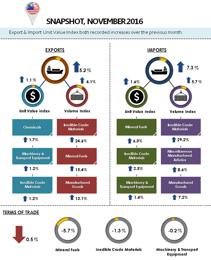 On a-month-on-month basis, in November 2016, the export unit value index registered an expansion of 1.1% to 108.0 points. This was led by chemicals (+1.7%), machinery & transport equipment (+1.2%) and inedible crude materials (+1.2%). Similarly, the export volume index rose 4.1% to 126.7 points. This was mainly due to inedible crude materials (+24.6%), mineral fuels (+15.4%) and manufactured goods (+13.1%). In seasonally adjusted terms, the export volume index increased 11.4%.