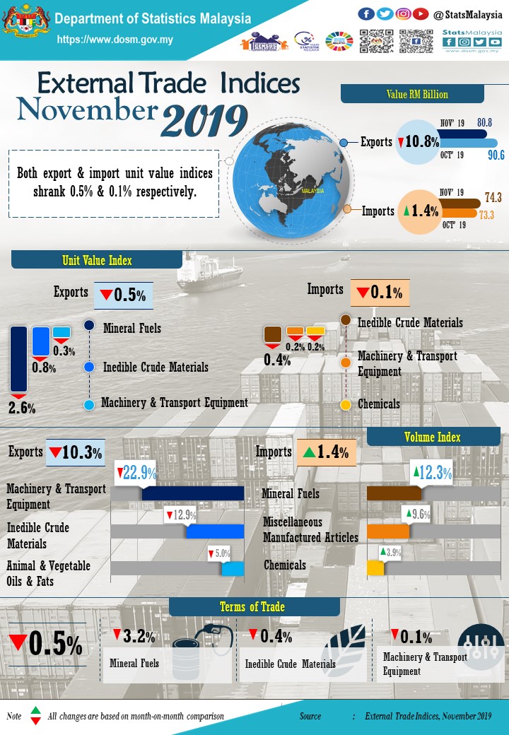 On a month-on-month basis, in November 2019, the export unit value index recorded a drop of 0.5% to 115.5 points which was mainly attributed to the decrease in the index of mineral fuels (-2.6%), inedible crude materials (-0.8%) and machinery & transport equipment (-0.3%). Meanwhile, the export volume index recorded a decline of 10.3% to 131.4 points. The decline was led by the decrease in the index of machinery & transport equipment (-22.9%), inedible crude materials (-12.9%) and animal & vegetable oils & fats (-5.0%). In seasonally adjusted terms, the export volume index fell 9.9% to 126.9 points.