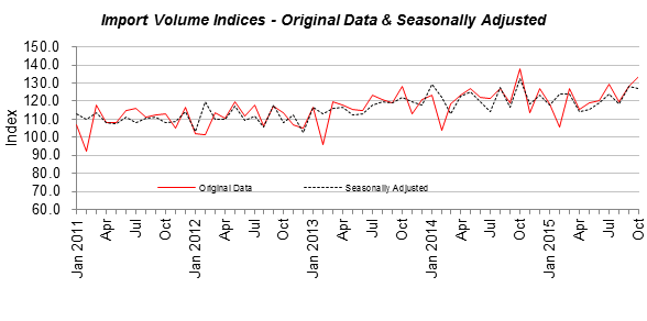 In October 2015, Malaysia’s import value decreased 0.4% from RM63.9 billion where the import volume index dropped 2.9% from 138.1 points. This decrease was mainly registered in mineral fuels (-17.3%), machinery & transport equipment (-3.3%) and manufactured good (-1.7%).
