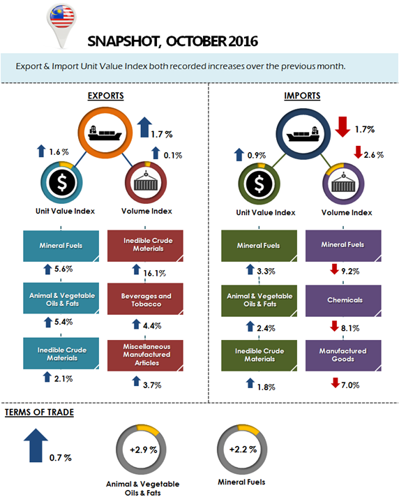 In October 2016, Malaysia’s terms of trade recorded an increase of 0.7% to 96.9 points when compared with the preceding month, while a reduction of 4.1% was recorded year-on-year.