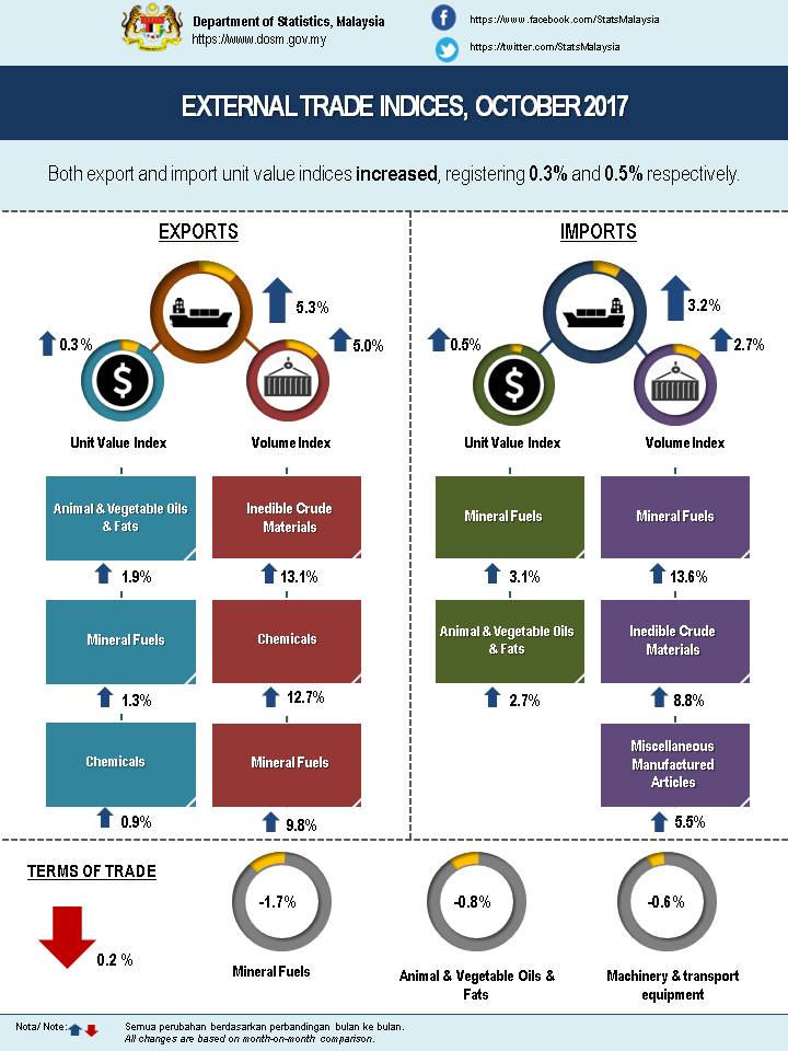 On a month-on-month (m-o-m) basis, in October 2017, the export unit value index rose 0.3% to 112.5 points. This was mainly contributed by animal & vegetable oils & fats (+1.9%), mineral fuels (+1.3%) and chemicals (+0.9%). Meanwhile, the export volume index also increased 5.0% to 137.7 points which was led by inedible crude materials (+13.1%), chemicals (+12.7%) and mineral fuels (+9.8%). In seasonally adjusted terms, the export volume index recorded a rise of 3.6% to 130.8 points.