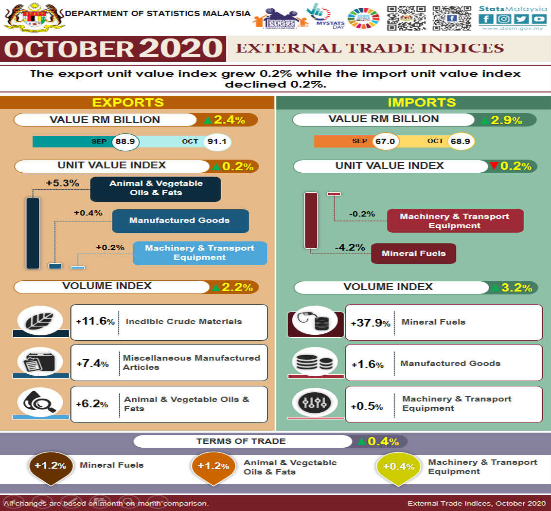 On a month-on-month basis, the export unit value index posted a positive growth at 0.2% from 110.5 points to 110.7 points in October 2020, which was due to the increases in the index of animal & vegetable oils & fats (+5.3%), manufactured goods (+0.4%) and machinery & transport equipment (+0.2%). Similarly, the export volume index also showed an increase of 2.2% from 151.3 points to 154.6 points which was contributed by the rise in the index of inedible crude materials (+11.6%), miscellaneous manufactured articles (+7.4%) and animal & vegetable oils & fats (+6.2%). The seasonally adjusted export volume index registered a drop of 6.8% from 155.2 points to 144.6 points.