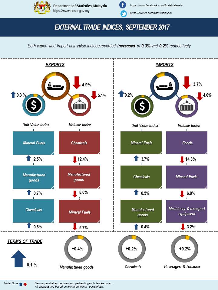 Malaysia’s terms of trade recorded an increase of 0.1% to 97.3 points when compared with August 2017. Meanwhile, a rise of 1.1% was recorded year-on-year basis.