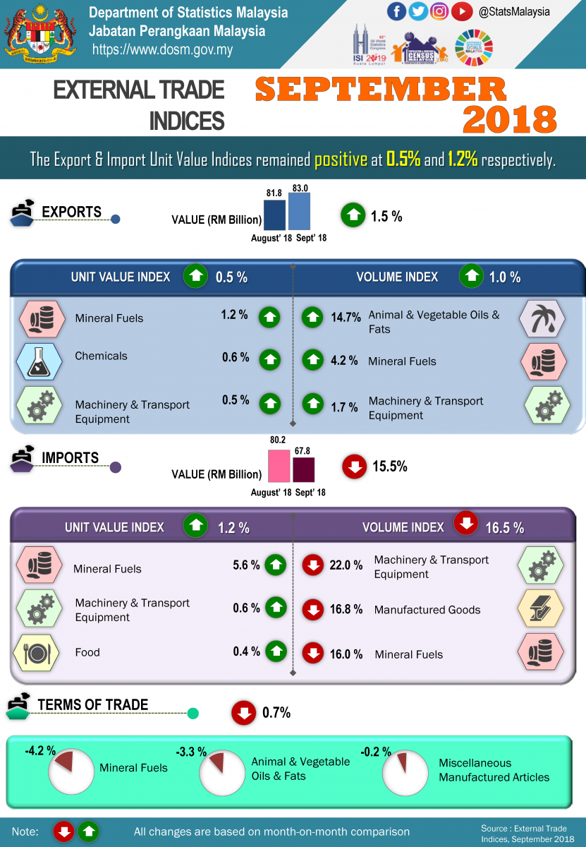 In September 2018, the import unit value index grew 1.2% to 120.2 points which was mainly led by mineral fuels (+5.6%) followed by machinery & transport equipment (+0.6%) and food (+0.4%). Meanwhile, the import volume index decreased 16.5% to 128.1 points. This was mainly attributed to machinery & transport equipment (-22.0%), manufactured goods (-16.8%) and mineral fuels (-16.0%). In seasonally adjusted terms, the import volume index decreased 16.5% to 126.0 points.