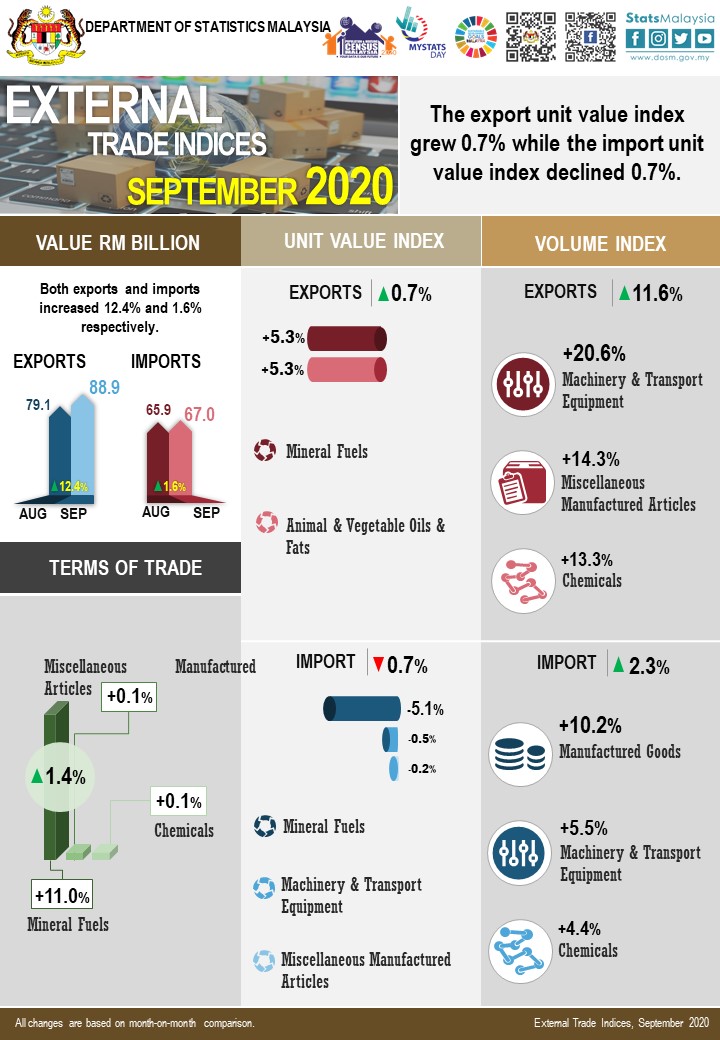 On a month-on-month basis, the export unit value index posted a positive growth at 0.7% from 109.7 points to 110.5 points which was due to the increases in the index of mineral fuels (+5.3%) and animal & vegetable oils & fats (+5.3%). Similarly, the export volume index also showed an increase of 11.6% from 135.6 points to 151.3 points which was contributed by the rise in the index of machinery & transport equipment (+20.6%), miscellaneous manufactured articles (+14.3%) and chemicals (+13.3%). The seasonally adjusted export volume index registered a rise of 15.4% from 134.5 points to 155.2 points.