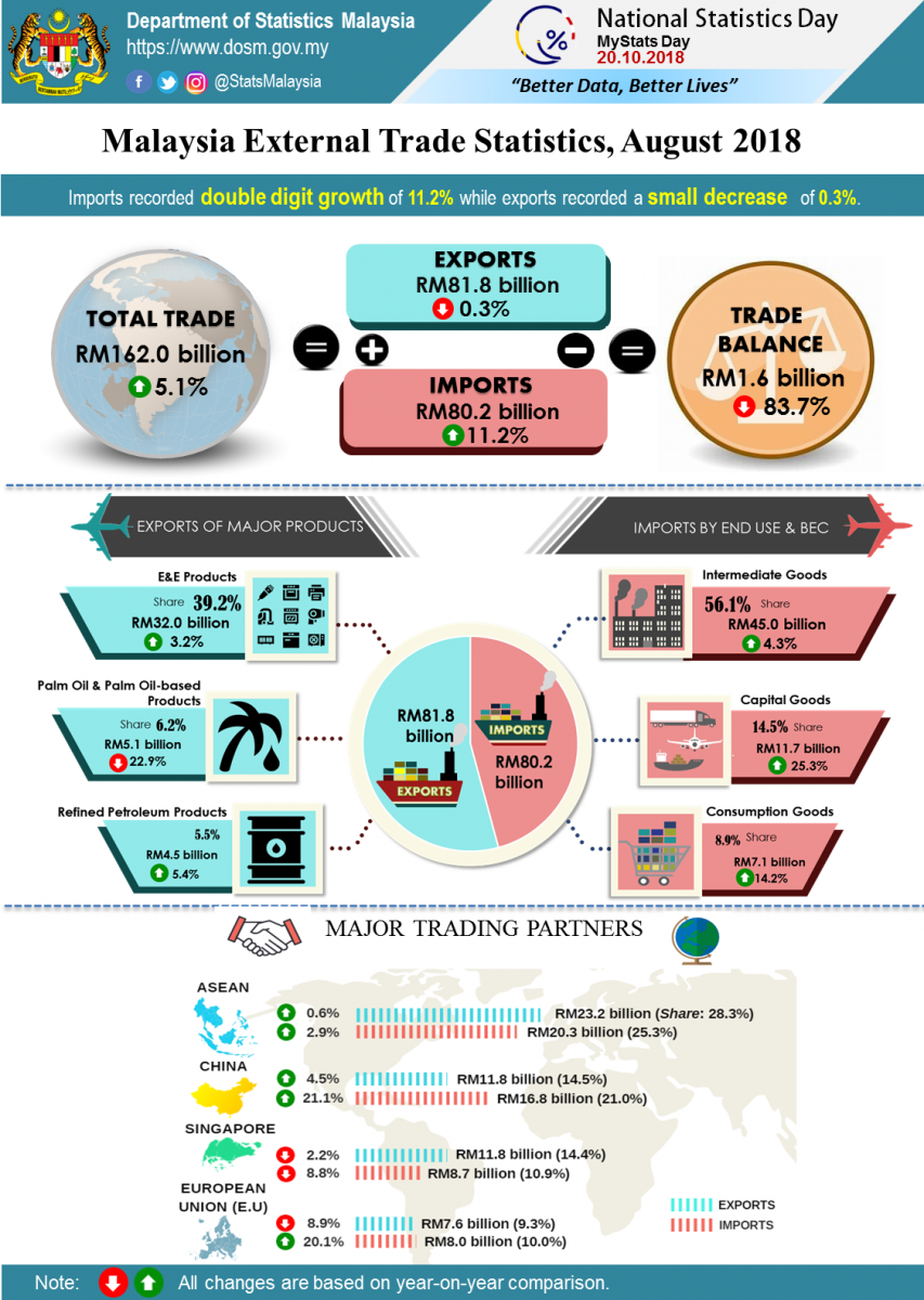 Total trade which was valued at RM162.0 billion expanded RM7.9 billion or 5.1% from a year ago. However,when compared to the previous month,it posted a decrease of RM2.0 billion or 1.2%. The trade surplus for August 2018 was RM1.6 billion, fell RM8.3 billion (-83.7%) from a year ago. It also posted a decrease of RM6.7 billion or 80.7% when compared to the previous month.