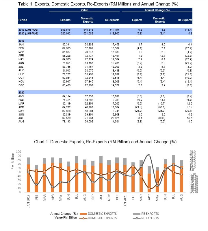- For the first eight months of 2020, exports declined by 5.8 per cent to RM620.6 billion compared to the same period in 2019.
