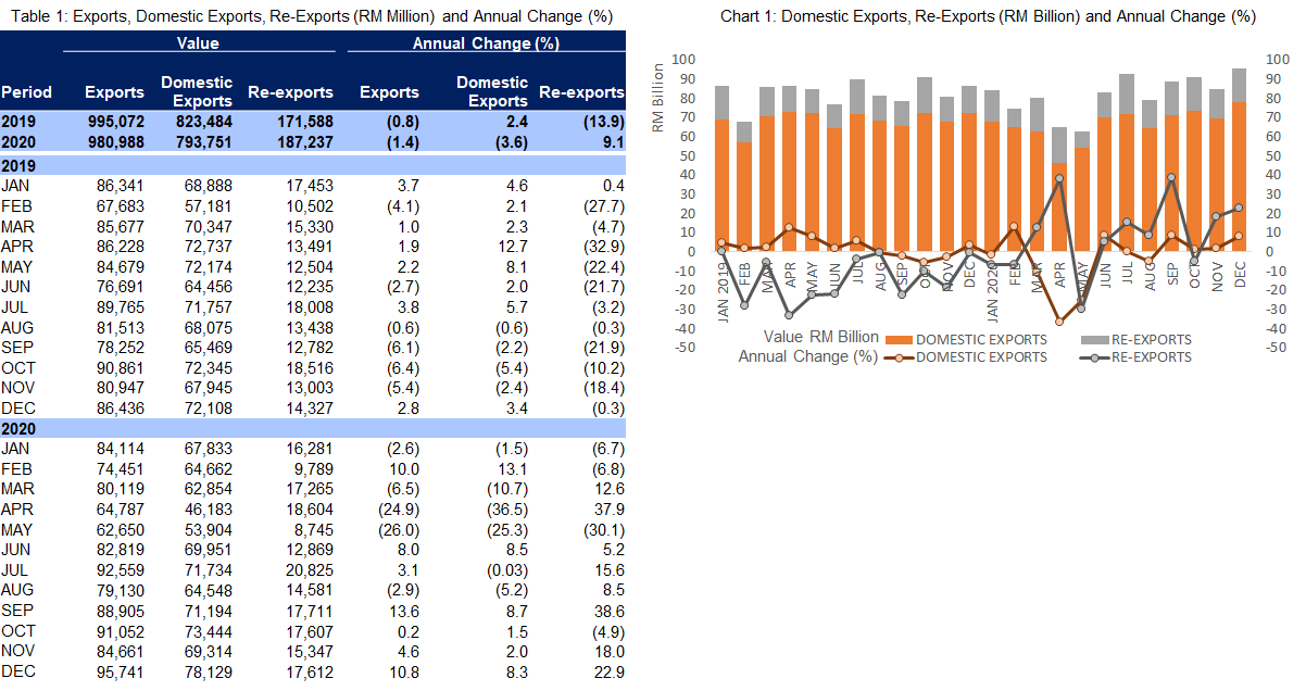 - In 2020, exports declined by 1.4 per cent from RM995.1 billion to RM981.0 billion.