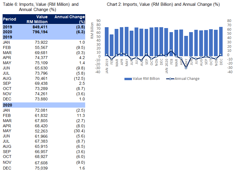 - In 2020, Malaysia’s imports contracted by 6.3 per cent or RM53.2 billion to RM796.2 billion as compared to 2019.