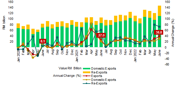 Malaysia’s exports remained strong with a new high value of RM146.2 billion, went up by 38.8 per cent in June 2022. The performance was driven by increases in domestic exports 30.6 per cent and accelerated growth of re-exports with 72.2 per cent. Domestic exports dominated total exports with an amount of RM110.6 billion and thus contributed 75.7 per cent, while re-exports totalled RM35.6 billion with a share of 24.3 per cent. On the other hand, exports recorded an increase of 21.3 per cent as compared to May 2022. Analysis of the seasonally adjusted terms month-on-month (m-o-m), exports rose by 19.5 per cent (+RM24.4 billion) to RM149.8 billion.