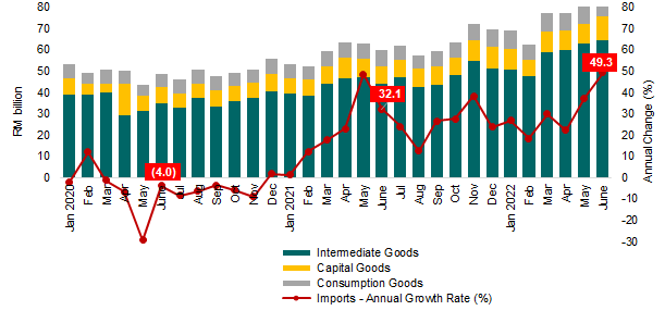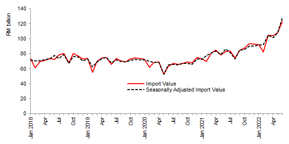 Malaysia’s imports reached all-time high value at RM124.2 billion and thus grew strong at 49.3 per cent as compared to the same period in 2021. In comparison to May 2022, imports increased 15.2 per cent (+RM16.4 billion). Referring to seasonally adjusted terms m-o-m, imports rose 19.2 per cent to RM129.1 billion.