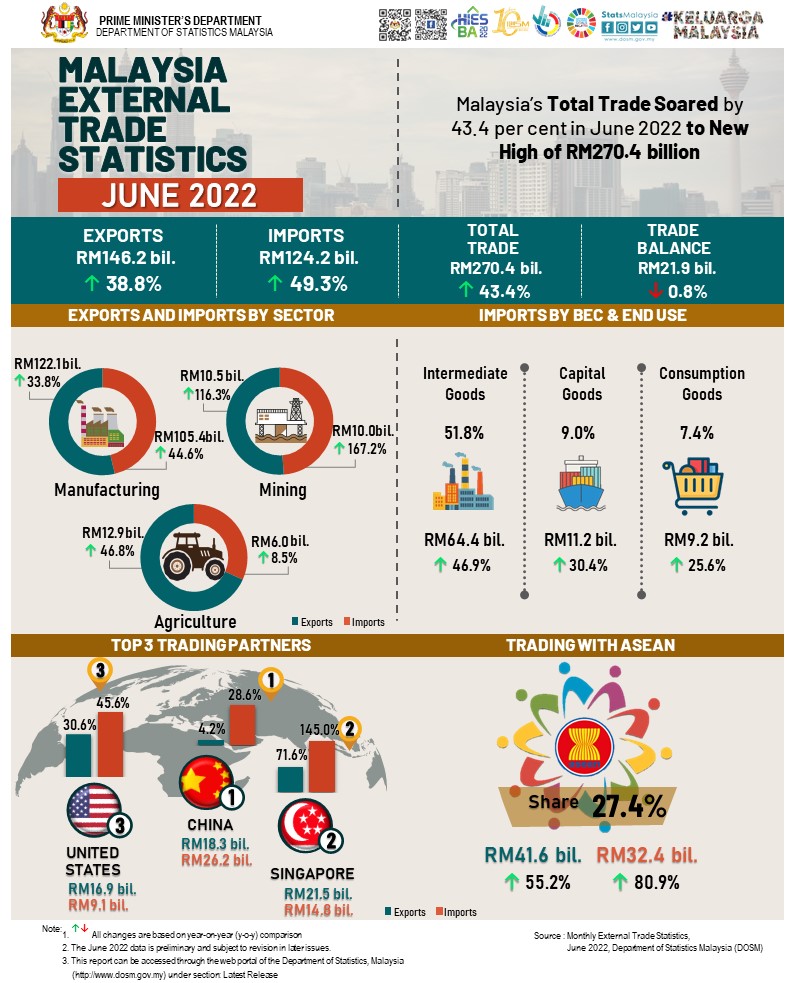 Malaysia’s total trade continued its strong performance in June 2022, with a value of RM270.4 billion and subsequently recorded a growth of 43.4 per cent from RM188.5 billion in the same period of preceding year. Exports and imports reached a new high value of RM146.2 billion and RM124.2 billion, respectively. In terms of growth, exports expanded 38.8 per cent while imports surged 49.3 per cent. Trade surplus amounted to RM21.9 billion, decreased 0.8 per cent as compared to June 2021.