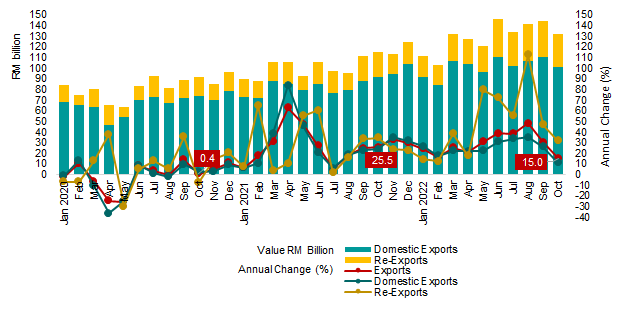 Malaysia’s exports was recorded at RM131.6 billion, increased by 15.0 per cent as compared to October 2021. The increase was driven by both domestic exports and re-exports. Domestic exports stood at RM101.2 billion and contributed 76.9 per cent to total exports, grew by 10.8 per cent. On the same note,re-exports with a value of RM30.4 billion, grew by 31.6 per cent y-o-y. Meanwhile, for monthly comparison, exports declined by 8.7 per cent or RM12.6 billion. Analysis of the seasonally adjusted terms month-on-month (m-o-m), exports decreased by 14.3 per cent or RM20.3 billion to RM122.4 billion.