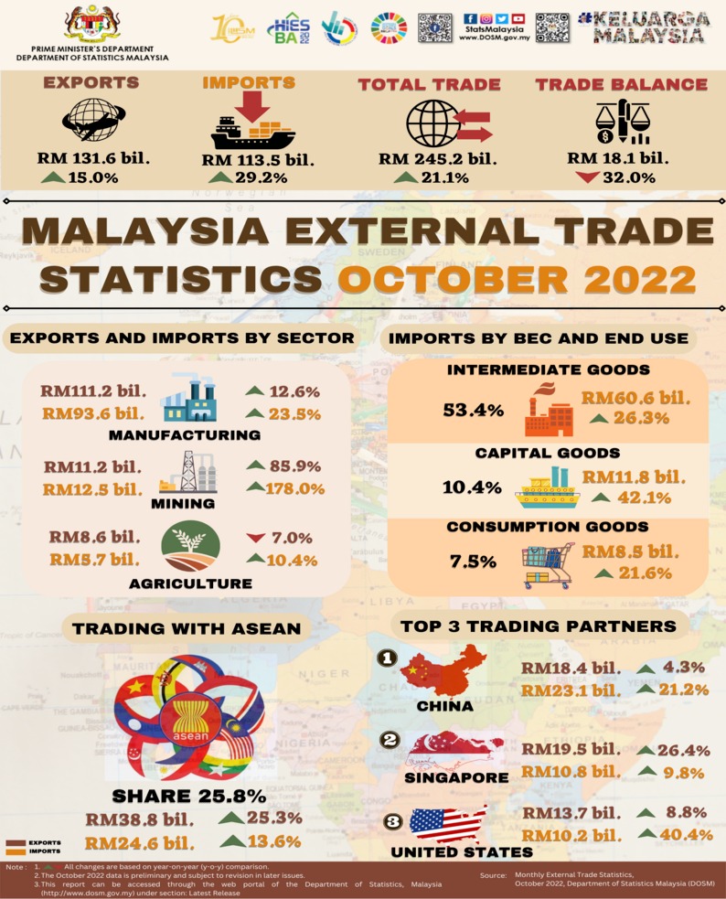 Malaysia’s total trade continued to grow with a double-digit growth in October 2022, surged by 21.1 per cent, reaching RM245.2 billion as compared to RM202.4 billion in the preceding year. Exports increased by 15.0 per cent to RM131.6 billion in October 2022. Imports amounted at RM113.5 billion rose by 29.2 per cent year-on-year (y-o-y). Trade balance remained to record a surplus with a value of RM18.1 billion, despite the decrease of 32.0 per cent from the previous year.