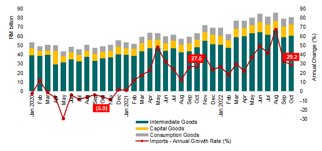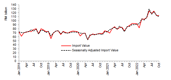 Malaysia’s import value in October 2022 continued to register an increase of 29.2 per cent or RM25.6 billion, reaching RM113.5 billion. On a m-o-m basis, imports rise marginally by 1.0 per cent or RM1.1 billion. Based on seasonally adjusted terms m-o-m, imports decreased by 2.1 per cent to RM110.8 billion.