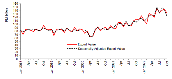 Chart 2: Actual Export Value and Seasonally Adjusted Export Value, RM billion
